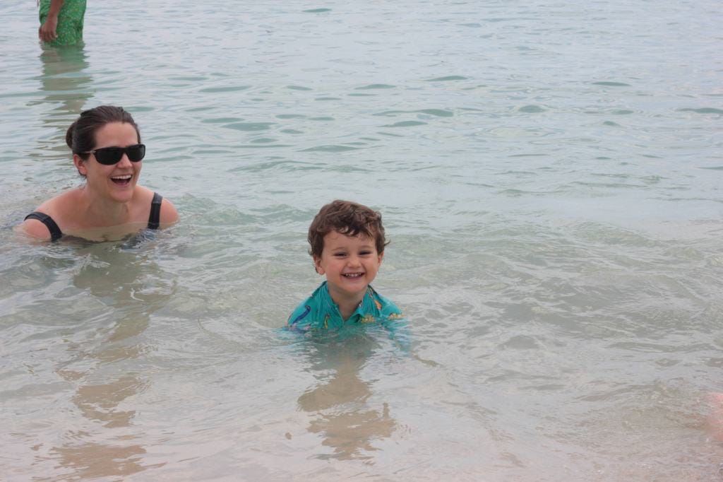 After a few trips, the beach routine will be established. The stuff is dropped between the two chairs, the backpacks are opened, and the tote bags - one each for bathing suits, sunscreen and beach toys, water bottles and snacks - will be hung up on the very convenient hooks under the umbrella. A quick trip to the changing room, which is pitch black compared to the million suns of the sand, and then the slathering of sunscreen, with a 15-minute timer set; the boys will play in the sand, and then, when the timer goes off, there's a race to the water, a quick splash, and then the unrestricted play of youth.